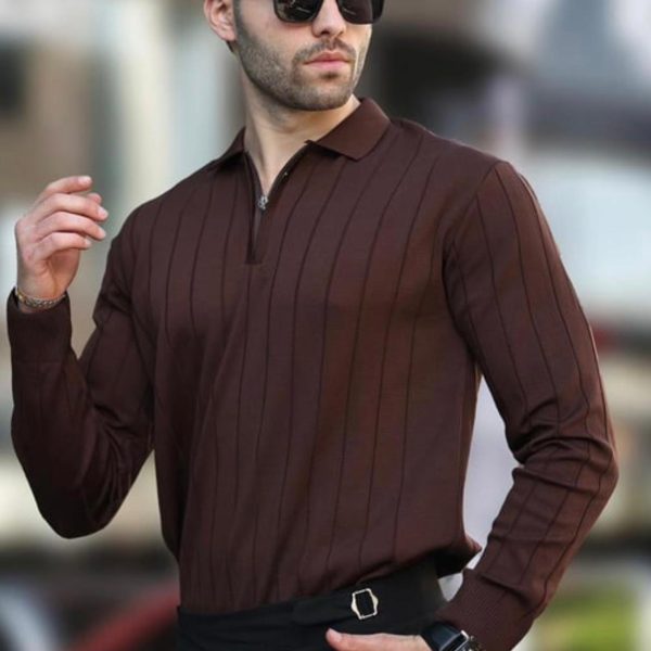 KAHVERENGİ İNCE FİTİLLİ POLO YAKA TRİKO