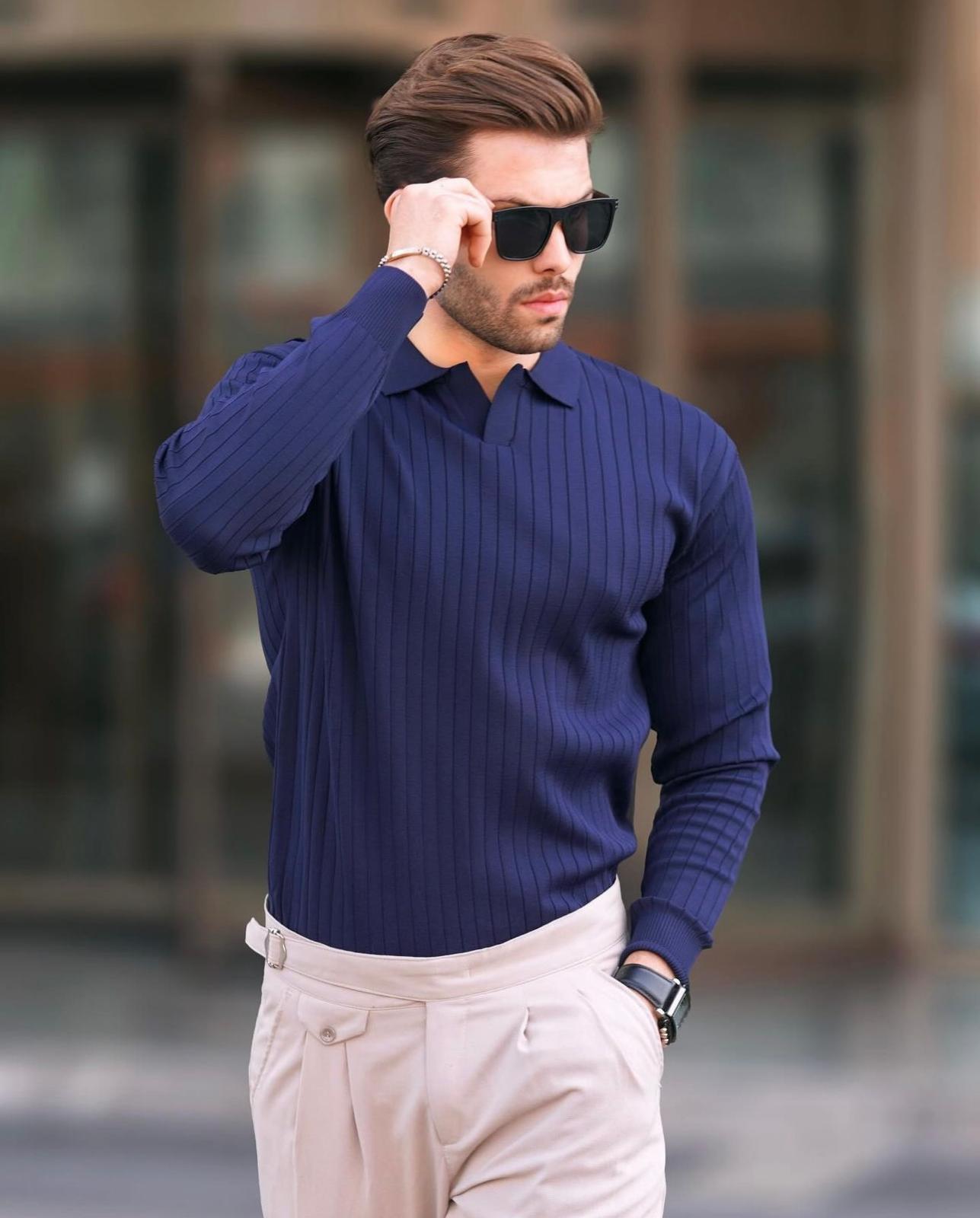 MAVİ İNCE FİTİLLİ POLO YAKA TRİKO
